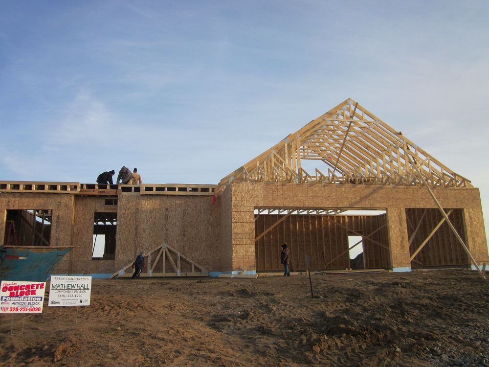after getting the floor sheathing as far as possible, we needed to get the garage roof trusses up & set in place in order to keep things moving forward. After studing the truss layaout provided by Mathew Hall Lumber co. We get up & in place just befor dark & the real wind picks up.IMG 0909IMG 0906