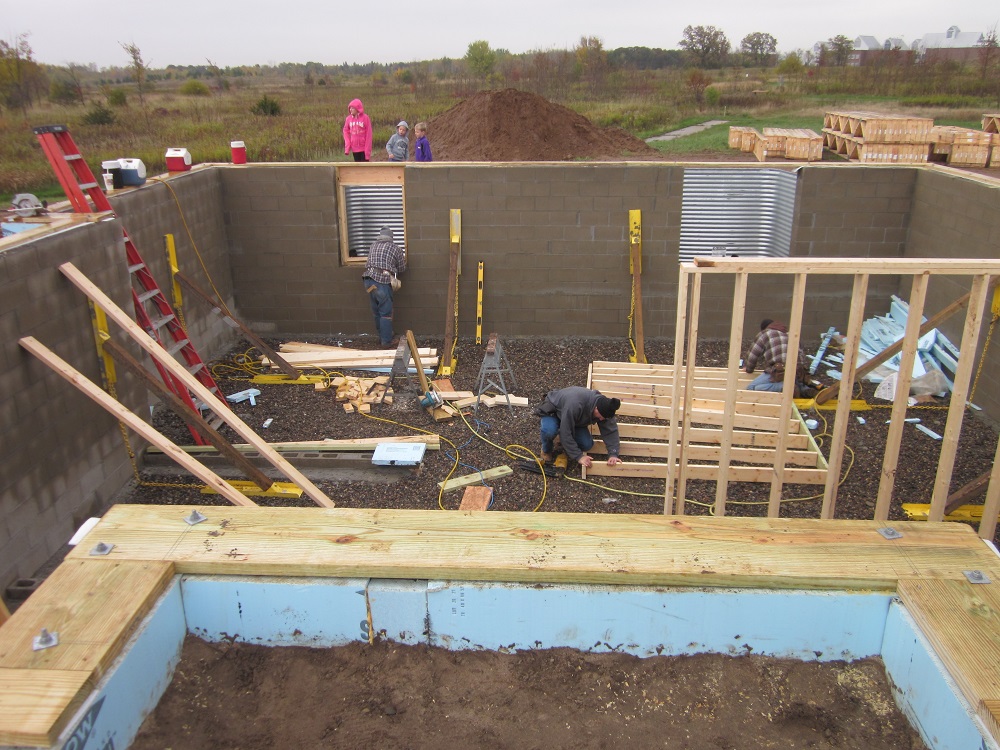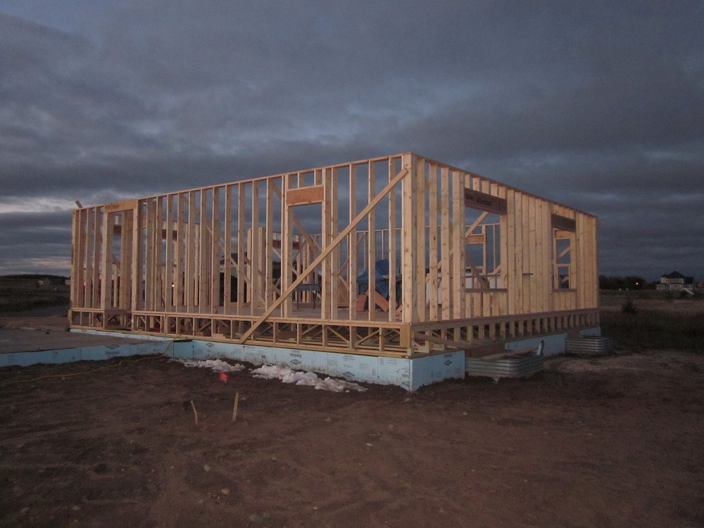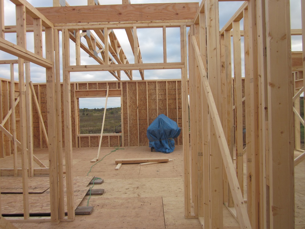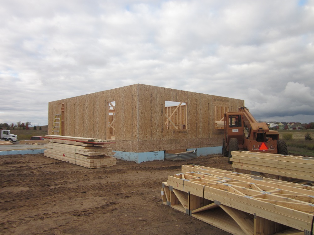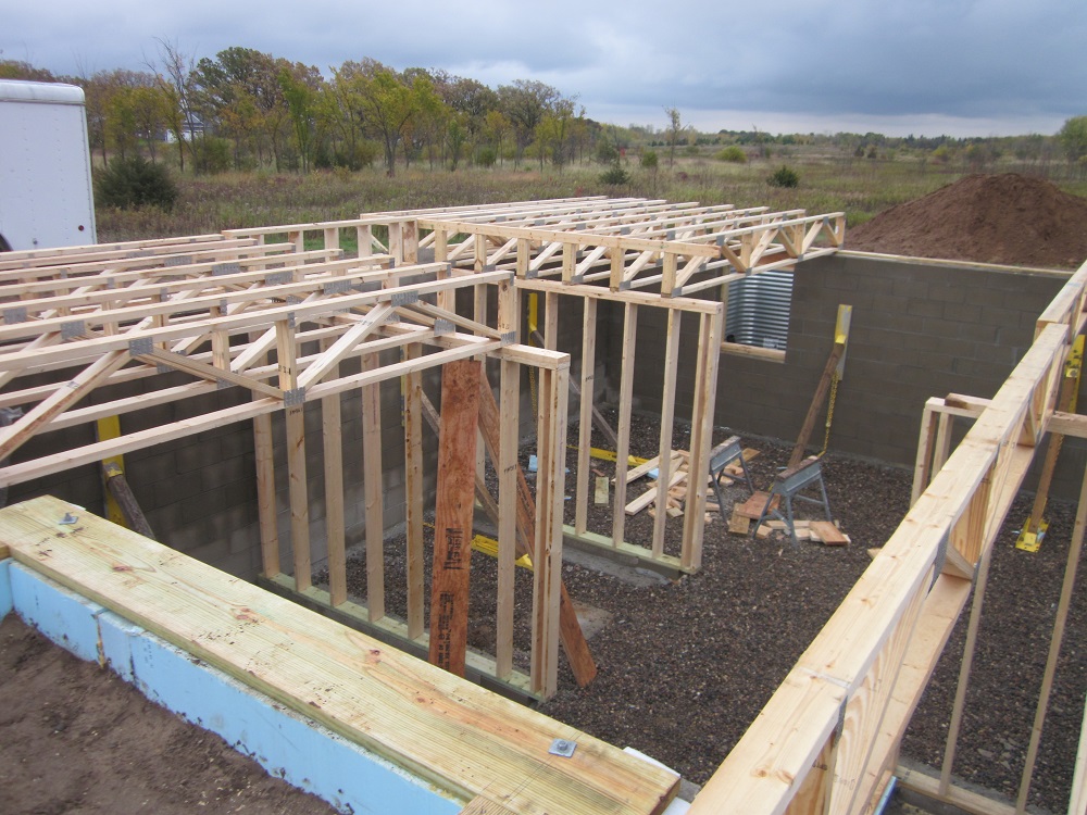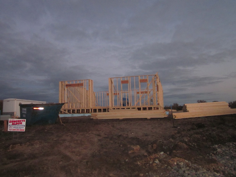 Finally get the framing going. Day one of framing was full of obsticales, but ended up getting alot done. Got the first supporting walls up & some floor trusses set in place. Jim Bosl from Bosl Construction took control & lead the way getting things rolling along & taking shape.