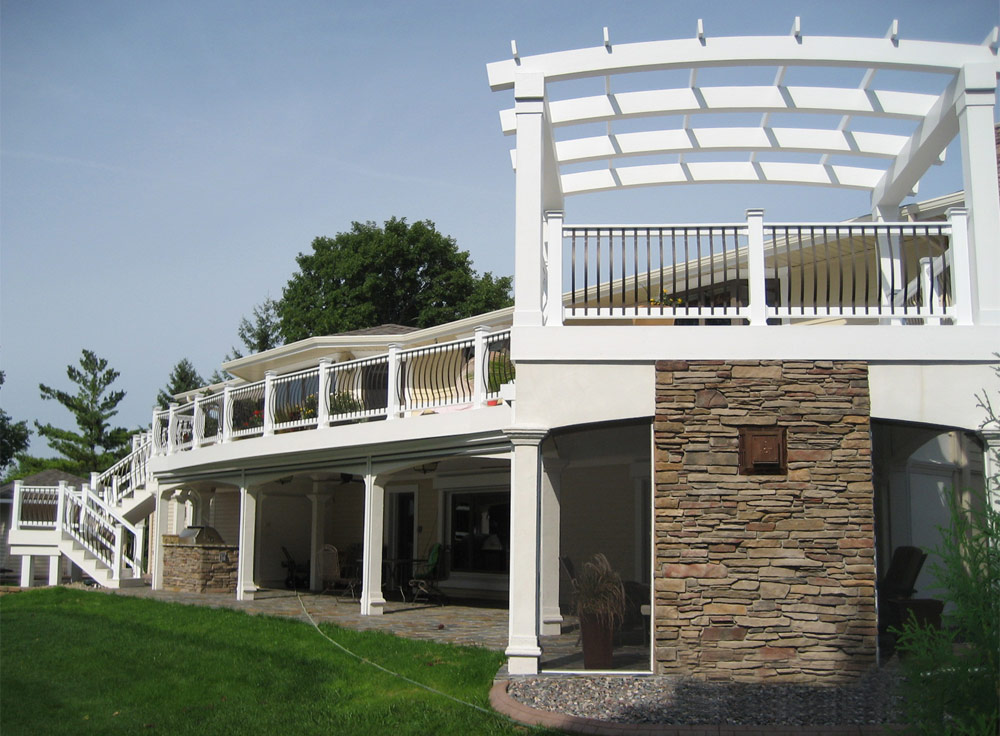 This deck and patio design offers the ultimate in outdoor living, featuring a curved railing and decking and lighting throughout on the posts, steps, and numerous other areas. The sitting area off the side offers a beautiful pergola.